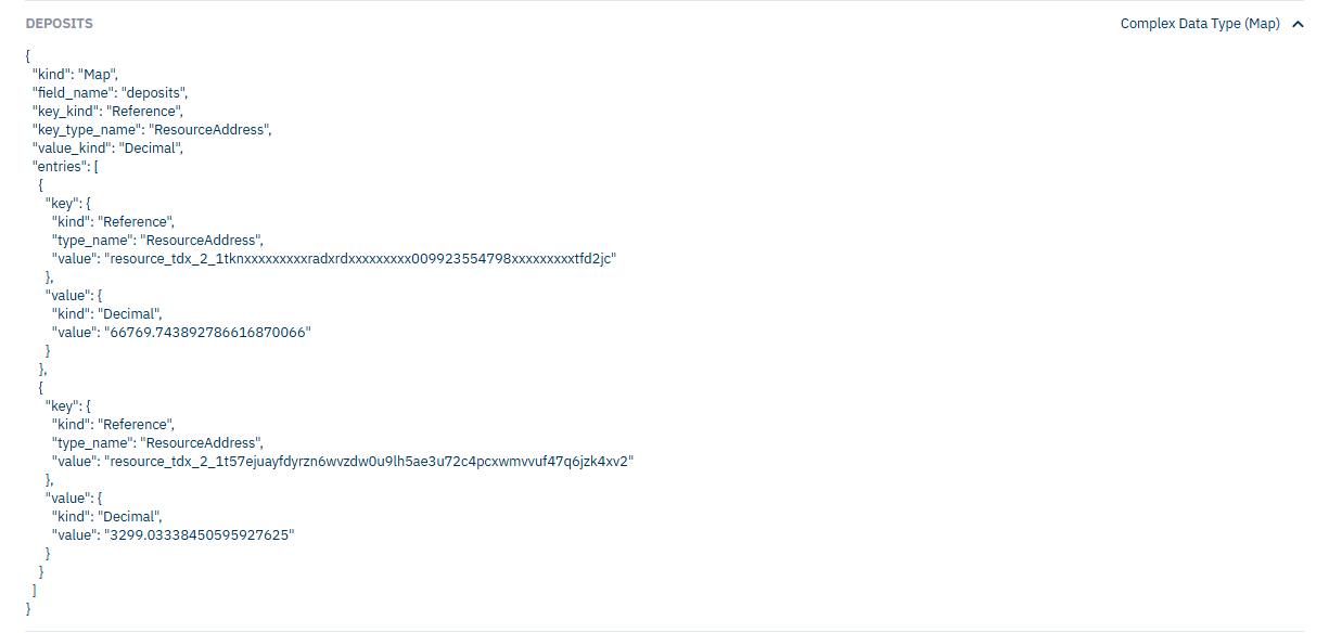 Deposits signifies the list of asset address ant the amount of each of the assets that the user deposited on the platform. Deposit amount is represented in SD Tokens.