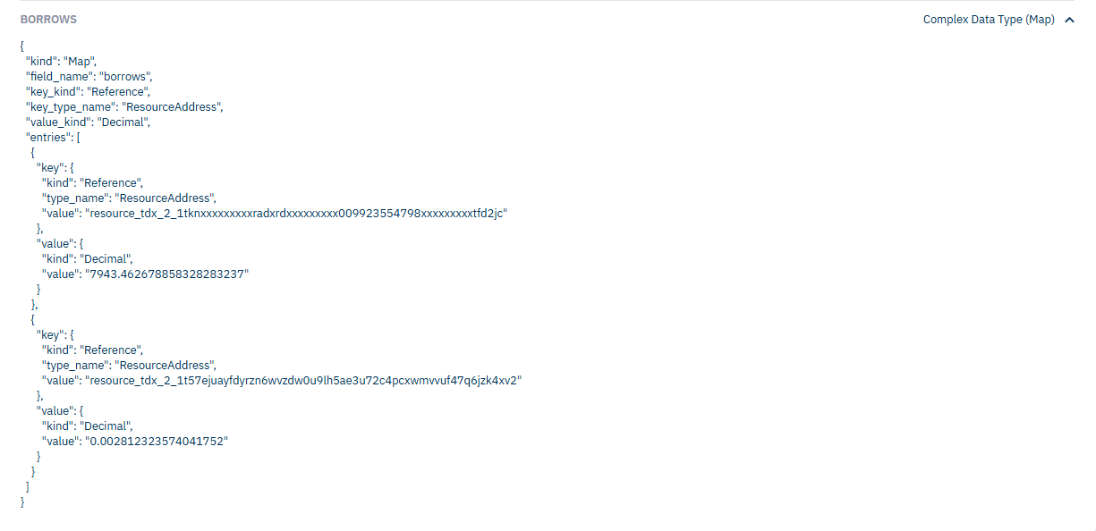 Borrows signifies the list of asset address ant the amount of each of the assets that the user has borrowed from the platform. Borrow amount is represented in SB Tokens.