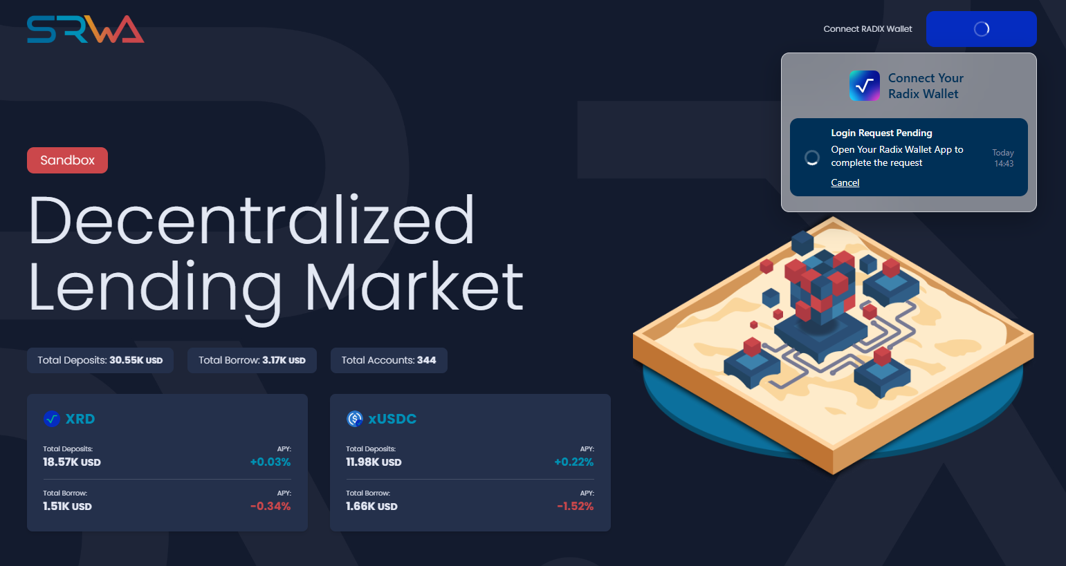 There, the User can see general info about the state of the platform and can use the Radix Connect Button to connect their wallet so they can use the SRWA Lending Protocol.&#x20;