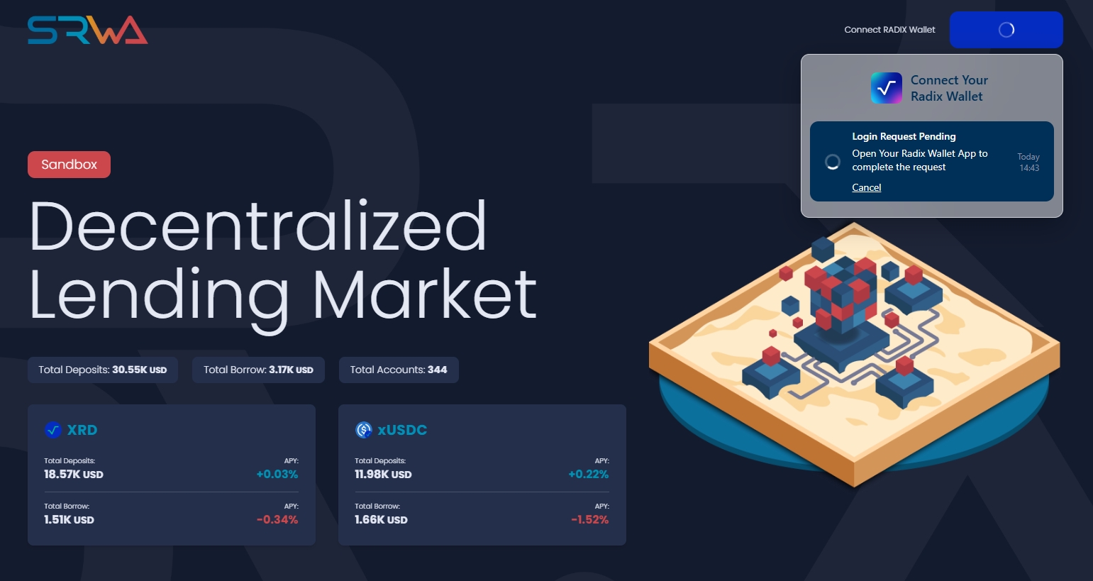 There, the User can see general info about the state of the platform and can use the Radix Connect Button to connect their wallet so they can use the SRWA Lending Protocol.