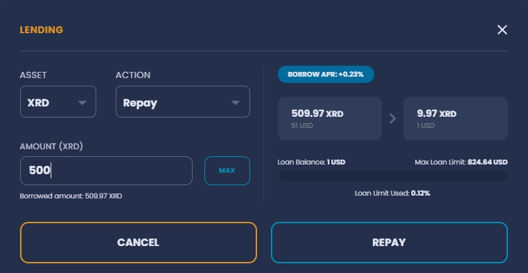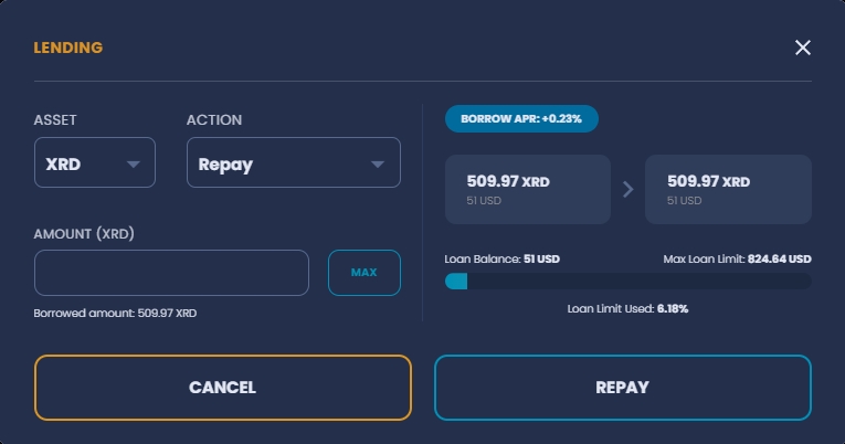 In the repay modal, users can choose the loan they want to repay, can see their borrowed amount, current borrow APR and with the changes in the amount input field, they can see how their loan limit and borrow balance are going to change accordingly.