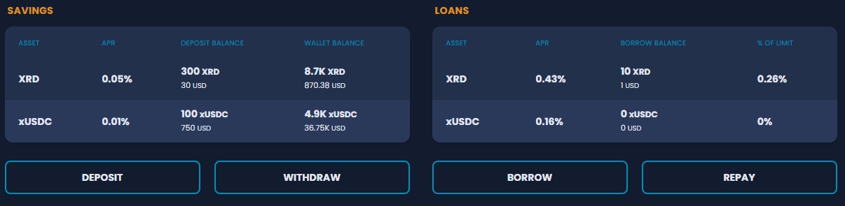 Savings and Loans section shows more detailed breakdown of users positions and has action buttons that can be used to interact with the platform.