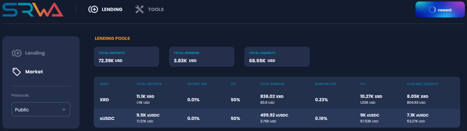On the top of the page, fields are showing current state of the SRWA Lending Protocol, sum totals of all of the deposits, borrows and total liquidity of the platform represented in USD.