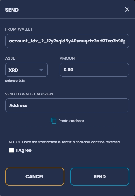 SEND button opens up the modal with prepared transaction where user can enter the details and send some assets to another account.