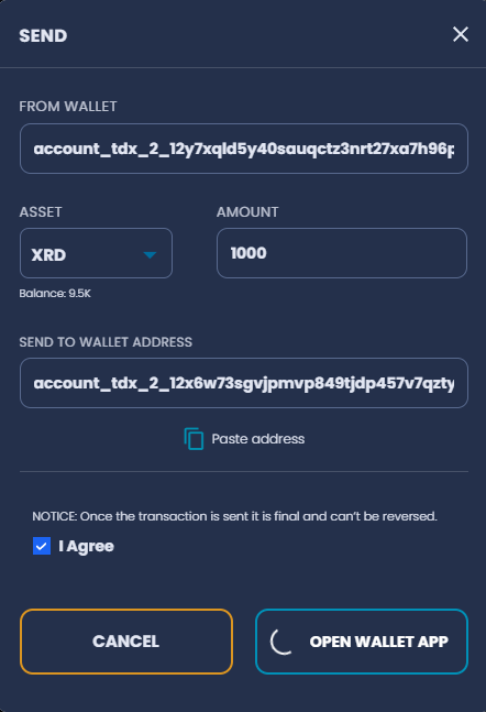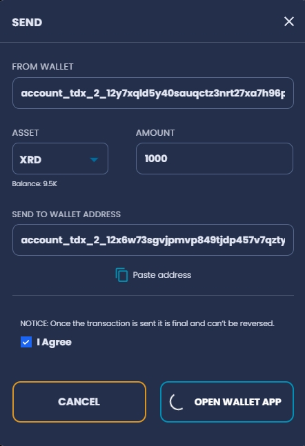 Clicking on the SEND button sends the transaction request to the ledger and the User is informed they should open their Radix Wallet to continue.