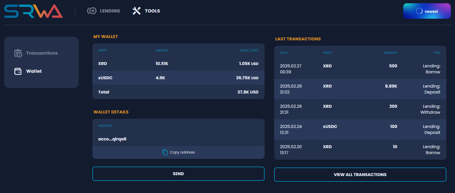 On the Wallet page, |User can see the state of their wallet regarding the assets that are used on the platform. User can use our interface to move the assets to another account, and track latest transactions that they made on the SRWA Lending.